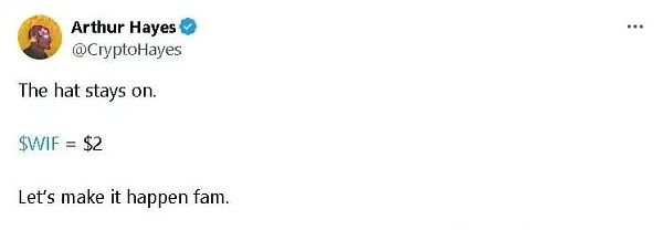 因此,WIF 也顺利突破了 1 美元,Coinbase 将其评为第一个突破 1 美元的狗狗币。随后,3 月 2 日,Arthur Hayes 也再次发推表示看涨 WIF,认为其能涨破 2 美元。