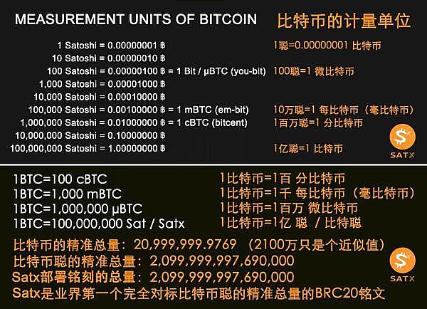 比特币等于 100,000,000 聪(一亿聪),比特币聪总量 2099999997690000 个。
