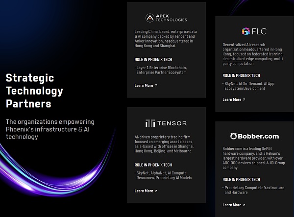 Phoenixl 的合作伙伴有顶尖的交易所 Binance,科技巨头字节跳动和阿里云,以及电商平台京东都是其投资者或合作伙伴。这些合作关系为 Phoenix 提供了技术支持和市场渠道,特别是在推动区块链技术与 AI 的融合方面。