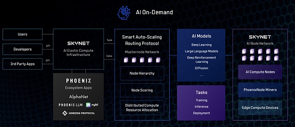 SKYNET 是架构的中心,它是一个 AI 弹性计算基础设施,专门处理和执行来自用户和开发者的 AI 任务,并根据需求动态地调整资源分配。