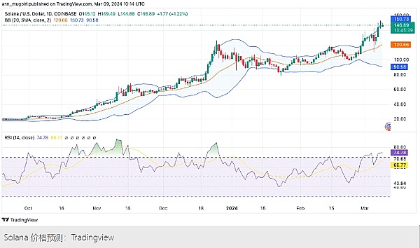 相对强弱指数 (RSI) 徘徊在 70 上方,表明出现超买情况。Solana 的价格目前为 147.67 美元,远高于 120.69 美元的 20 日简单移动平均线,进一步支撑了看涨前景。