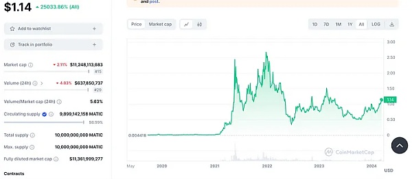 此外,Polygon 希望将以太坊打造成一个多链系统,以提高可扩展性、互操作性和灵活性。这一策略与 Cosmos 和 Polkadot 等其他多链平台类似。当前价值为 1.14 美元,按代币市值排名第 15 位。