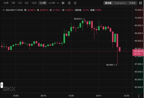近12 个小时持续震荡走低,稍早约08:45,BTC 最低一度插针触及66,944,撰稿当下仍未站回6.8 万美元。