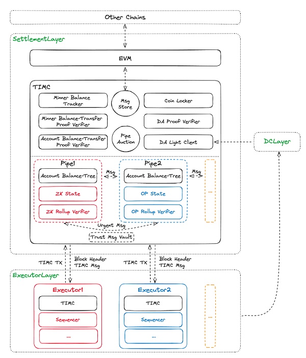 可信模块间通信协议(TIMC)是 Axiomesh 革命性的大脑,它涉及区块链技术的多个关键领域,用创新的视角重新定义了跨链通信、Rollup 机制和经济模型。它支持多种 Rollup 类型,允许执行层无限制选择的 ZK 算法,这赋予了执行层前所未有的灵活性和自由度。其中: