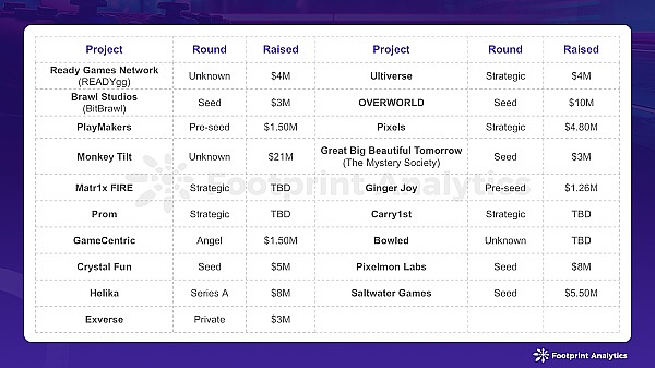 多家游戏工作室和游戏,如 Brawl Studios(BitBrawl)、Matr1x FIRE 以及 Pixels 等,都成功获得了新的融资。与此同时,游戏平台作为一个备受瞩目的领域,也涌现出了一批杰出的企业,如 Crystal Fun、Ultiverse 以及 OVERWORLD 等,它们都在各自的领域取得了显著进展。特别值得一提的是,OVERWORLD 在 Xterio 生态系统的孵化下,成功获得了1,000 万美元的种子轮融资,致力于开创跨平台 RPG 游戏的先河。