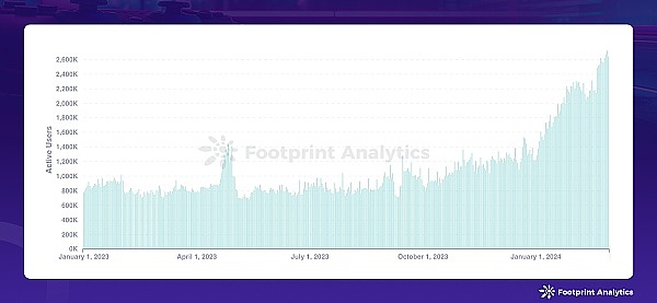 此外,通过游戏与区块链平台之间的相互增长来拓展生态系统,是公链获得增长的另一种举措。Web3 游戏 Pixels 在 2023 年 10 月底从 Polygon 迁移至 Ronin,充分利用了 Ronin 卓越的互操作性和营销支持。这一转变显著提升了该游戏的知名度和链上活跃度。仅 2 月份,Pixels 就实现了超过 150 万次的链上交互,用户数量也接近了 100 万的里程碑。这一增长趋势无疑对 Ronin 也产生了积极的影响,突显了双方合作带来的互利共赢。