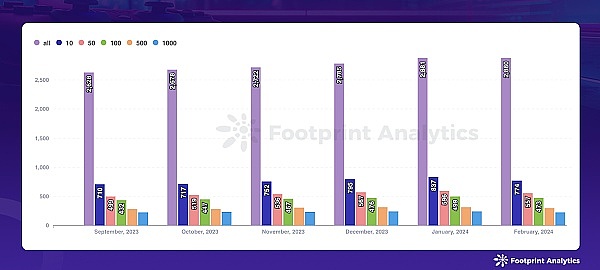 2 月份,日活跃用户(钱包)数量继续攀升,达到 230 万,较 1 月份增长 28.9%。区块链游戏行业建设者的不懈努力成功吸引了更多 Web2 游戏工作室和玩家进入 Web3 游戏领域,推动了行业的快速发展。
