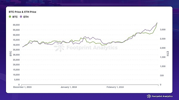 2024 年 2 月,比特币和以太坊均呈现显著增长态势。其中,比特币强势上扬,涨幅高达 46.5%,月末收盘价达到 62,404 美元,自 2021 年第四季度以来首次突破 60,000 美元大关,距离其历史最高点仅差 9%。以太坊表现更为亮眼,涨幅略超比特币,达到 48.1%,月末收盘价为 3,383 美元。