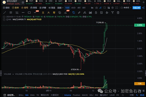 自2024年2月以来,比特币价格加速上涨。从3月5日达到69000美元高点后,比特币价格一度跌超10%,但仍大体在朝着更高点持续,8日晚,比特币报价突破70000美元,时至今日,更是突破71,000美元,创历史最好记录。