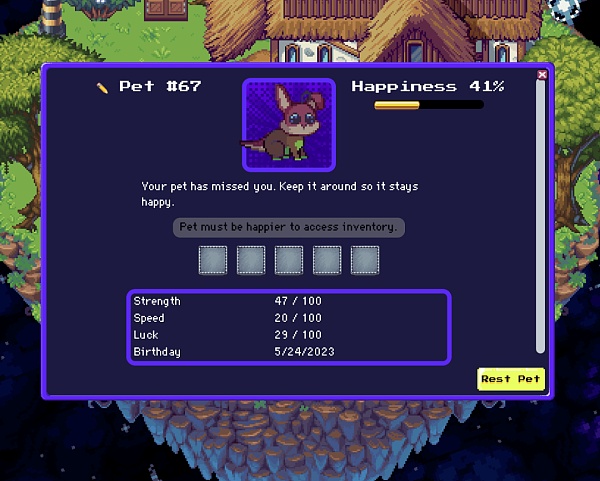Pixels游戏以像素风格为主题,是一款农场模拟游戏。玩家的核心体验在于收集和管理各种资源,包括作物、木材、石头等,这些资源根据稀有度等级进行分类。