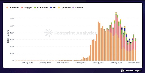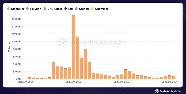 分析以太坊、Polygon、BNB 链、Cronos、Optimism 和 Sui 等公链的数据,我们发现交易量降至 8.4 亿美元,较 1 月份下降了 16.1%。同时,交易量下滑了 25.8%,独立用户(钱包)数量也减少了 14.6%。这种下降趋势部分归因于2月份天数较少。此外,关键 NFT 系列出现明显波动,市场动态的变化和投资者情绪的转变,也是造成下滑趋势的原因。