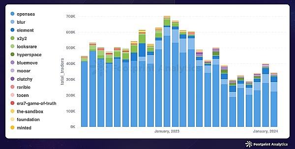 尽管独立用户(钱包)数量从 1 月份的 27.9万下降到 22.4 万,OpenSea 仍以其庞大的用户基数在 NFT 市场中占据领导地位。与此同时,Blur 的用户数量有所增长,达到了 6.1 万,而 Element 的用户数量则略有下降,降至 3.6 万。