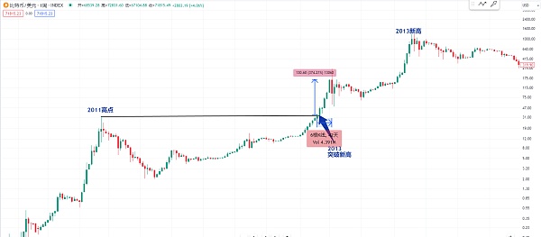 而且我们可以再观察一下比特币在2012年的牛市 涨到这个位置2013年2月份左右 他在这个位置突破了2011年的高点 我们可以观察一下从这根K线开始计算 同样也是在6周左右的时间 也就是40天左右 他这个位置也是涨了接近400%
