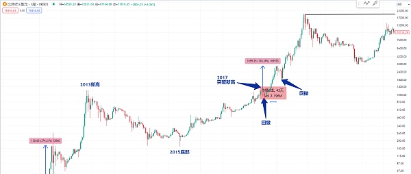 然后我们同样可以看一下比特币在2017年的牛市 从2015年的底部涨上来到2017年的2月份 就是这个高点位置他突破了比特币之前在2013年创出的历史新高 然后我们可以观察一下他在这个位置也是有回撤