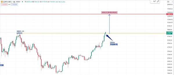 所以我们尽量去观察一下比特币在今年的上半年有没有可能在7万美元的基础上再涨100% 从而达到14万美元 到时候我们再看比特币会不会回撤 或者是在目前的这个位置我们也要防止会不会有回撤 毕竟空间也是涨了这么多