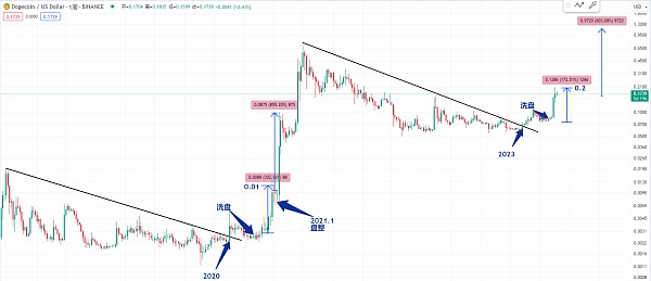 所以我们观察一下目前的狗狗币从这个低点开始到这一次的0.2附近 他是涨了接近200% 我们可以观察一下在2020年当时的这个压回突破涨到0.01这个高点位置他是涨了300%