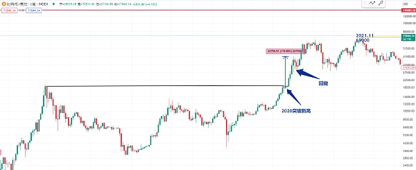 因为我们可以观察一下比特币在历史上2020年的这个位置 当时价格突破了历史新高 他是在这个位置没有回撤 然后我们可以观察一下当时在这个位置价格是突破了前面的新高 我们可以看一下他后面在这个位置是连续四个星期上涨了100% 然后在这个位置有一个回撤