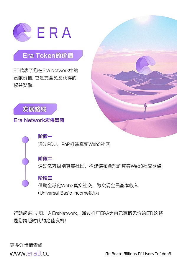 Era network产品,可以快速建立真实用户网络,掌握线上流量端口。作为私域流量的孵化器,帮助每个人建立属于自己的私域社群。因此,选择Era network产品,可以在Web3行业发展中立于不败之地。