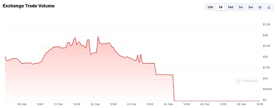 23年9月,BitForex就称自身为全球市值领先的加密货币交易所之一,日交易量约为26亿美元。根据CoinGecko数据,2月22日至24日期间,该交易所的交易量从25亿美元下降至10亿美元。目前已无数据机构记录追踪该平台,但有趣的是,早在19年,BitForex就被Chainalysis曝光过交易数据造假,指出平台真实流动性仅为其报告交易量的 1/800,造假比例让人瞠目结舌。