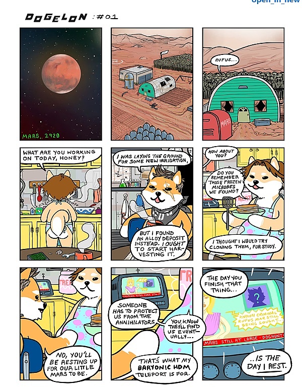 Dogelon Mars 采用了 Dogelon 的幽默喜剧故事作为背景,Dogelon“探索银河系最伟大的奥秘,并寻求在他在星际旅行中结识的朋友的帮助下重新殖民这颗他曾经称之为家的星球。”在官网的网站上发布了几部短漫画,讲述了Dogelon的火星冒险故事,在那里他遇到了朋友并继续冒险。