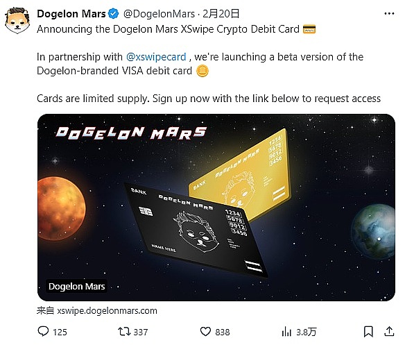 公益事业也在为 Dogelon Mars 带来积极影响,Dogelon Mars不仅是一种加密货币,它还致力于实现更广阔的社会目标和公益事业。通过其慈善项目,Dogelon Mars团队已经开始向不同的慈善机构捐款,从而塑造了一个正面的社会影响形象。这种结合公益的策略可能会吸引那些希望他们的投资能够产生积极社会影响的投资者。而目前,在此基础上,Dogelon Mars 与 Swipe 合作推出加密借记卡,正在让 Dogelon Mars 在支付领域出圈,并被更多的 Web2 群体所接受。