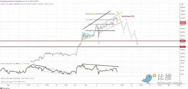 然而,Swissblock 分析师警告称,根据比特币价格与4 小时图表上 RSI 动量指标之间的走势图,BTC的上涨势头正在减弱,RSI 是一种广泛使用的动量指标,用于衡量资产价格变化的速度和规模。分析师表示:“我们预计 BTC 下一步将跌至 58,000-59,000 美元(较当前价格下跌 20%),随后将恢复上涨趋势,因为顶部还没有到达”。