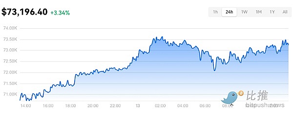 但比特币的涨势仍在持续。比推终端价格数据显示,比特币当前价格为73,196.40美元,在过去 24 小时内上涨了 3.3%。