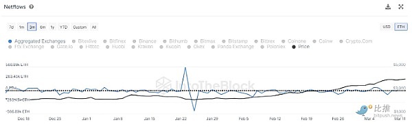 IntoTheBlock的数据显示,以太坊的 Netflow 指标显著上升,交易量达到 8,529,000 ETH。这表明以太坊流入交易所的数量超过了流出量,导致交易平台的储备不断增加。暗示了价格即将下调的可能性。