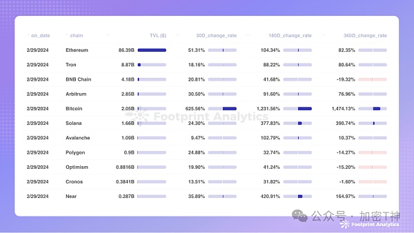 在二月结束时,公链加密货币的总市值飙升至1.9万亿美元,相较于一月,增幅高达42%。在这场增长浪潮中,比特币、以太坊、BNB链和Solana无疑扮演了领军角色,它们的市场占有率分别达到了64.0%、21.4%、3.3%和3.0%。