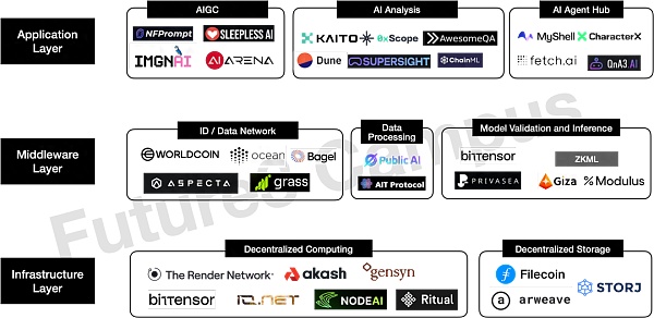 结合上述AI生产流程和AI与Web3结合的方向,以及当前市场上主流的AI+Web3项目,我们梳理出了AI+Web3产业图景,AI+Web3产业链可以分为三层,分别为基础设施层、中间层和应用层。