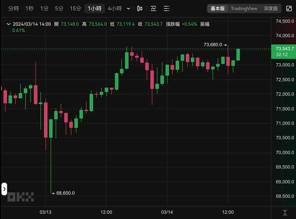 比特币(BTC)在过去一周多次刷新历史新高,今天(14日)中午触及了73,680美元,距离7.4万美元仅一步之遥,现价73,543美元,近24小时上涨了1.58%。