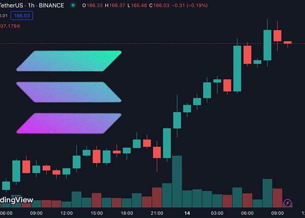 此外,Solana生态板块也呈现出普涨的趋势。其中,SOL近24小时涨幅达到10.8%,稍早最高冲至169.28美元,目前报价166.03美元,是市值排名第五的加密货币。