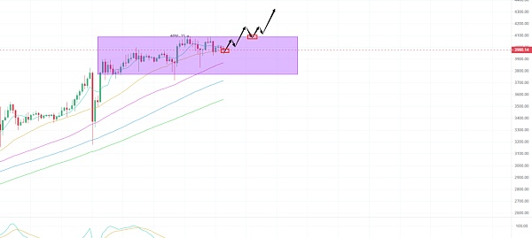 以太的走势相对就要弱很多了,虽然坎昆升级已经落地并且开始升级了,不过目前价格一直在4000 附近徘徊震荡,这波上涨相比大饼明显的弱势很多,最主要的原因事 etf 现货的审批还未通过,山寨的季节预计要在5月后 以太 etf审批通过之后了,到时候以太放量补涨的话 别的山寨也会出现轮番跟涨补涨,近期内预计会跟着大饼向上再冲刺两三百刀!
