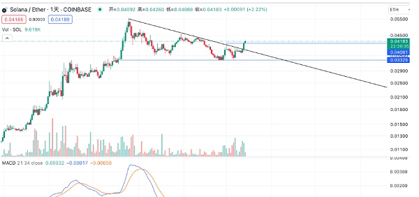 SOL也是我重点关注对象之一。昨天收盘后,日线级别分别完成了对BTC和ETH的汇率突破。