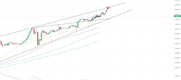 大饼目前的走势一直在预期之内,最近持续新高加上洗盘和etf 流动性的涌入也是大饼上涨的主要原因。目前的走势依旧很强势,主要etf有持续的流动性注入,小级别盘整之后会继续向上冲刺,冲破75000 加速还会向上打个历史新高!上升楔形上边沿线对标价格 76000 附近!