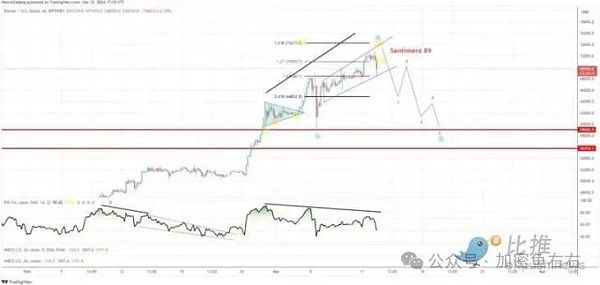 尽管如此,Swissblock分析师警告称,根据比特币价格与4小时图表上的RSI动量指标走势,BTC的上涨势头正在减弱。RSI是一种常用的动量指标,用于衡量资产价格变化的速度和幅度。分析师表示,他们预计比特币的下一步将是跌至58,000-59,000美元(下跌幅度约20%),之后将会恢复上涨趋势,因为顶部尚未到达。