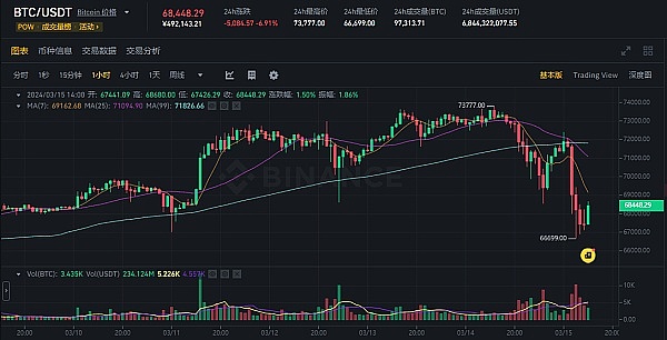 然而,截至3月15日上午,比特币价格突然急剧下跌,跌破了67,000美元的关键支撑位,据Tradingview数据显示,截至当前,比特币价格为68448美元,24小时跌幅扩大至8.18%。