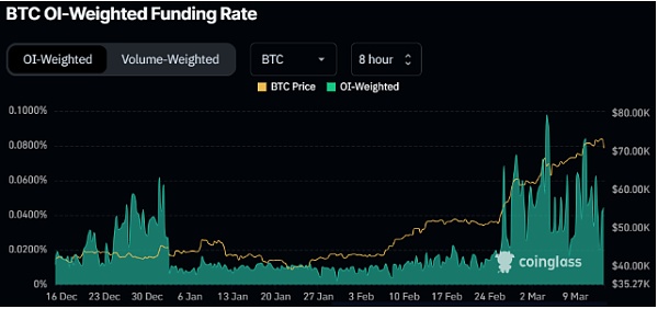 自2月底以来,杠杆期货头寸的开仓资金费率一直在上升,这表明着看涨情绪的持续增强,市场参与者对未来的乐观态度愈发显著。