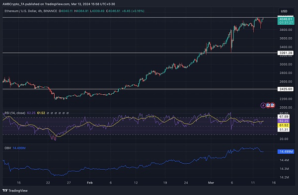截至发稿时,ETH 交易价格为 4046 美元,并且已经稳步攀升至该价格水平。尽管进行了一些小幅调整,但总体趋势仍然看涨。