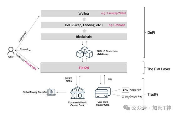 二、Web3银行协议Fiat24 Fiat24是一家获得瑞士金融市场监管局(FINMA)许可的金融科技公司。他们推出了第一个完全基于智能合约驱动的Web3银行协议,在公共区块链(Arbitrum)上搭建了银行逻辑。该协议为用户提供一系列Web3银行服务,包括创建链上银行账户、进行出入金、加密消费支付、储蓄、转账、换汇等功能。