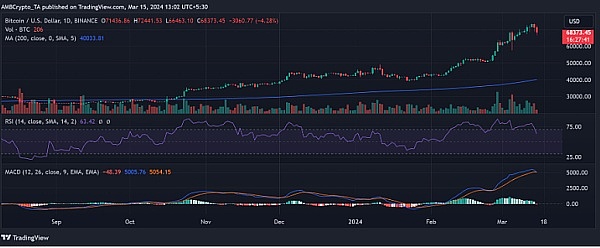 此外,这也标志着比特币相对强度指数(RSI)自那时以来首次退出超买区域,RSI 趋势低于 70。尽管出现这些下跌,但比特币仍处于强劲看涨趋势。