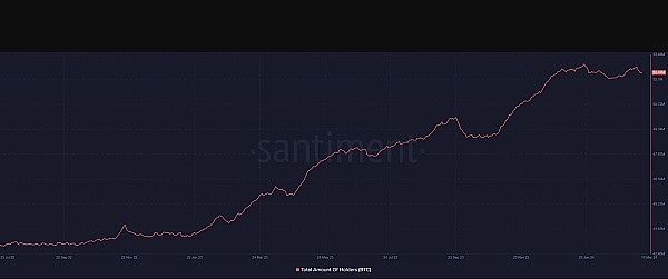 根据对 Santiment 指标的分析,比特币持有者数量略有减少。图表显示,3月10日左右,持有者总数接近5280万。