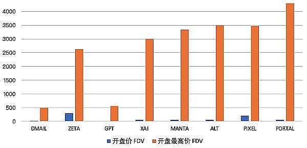 近一个月,OKX Jumpstart 上线了 3 个项目,DMAIL、ZETA、GPT。Binance 上线了 5 个项目,XAI、MANTA、ALT、PIXEL、PORTAL;根据统计,以开盘价作为计算,大部分项目普遍 FDV 为 5000 万美元。不过该价格普遍为项目最低价,投资者一般难以以该价格买入。若是以开盘最高价计算,FDV 普遍可达到 30 亿美元。当然,这也取决于项目上线的平台。就目前的数据而言,上线 Binance 的项目 FDV 普遍较高。