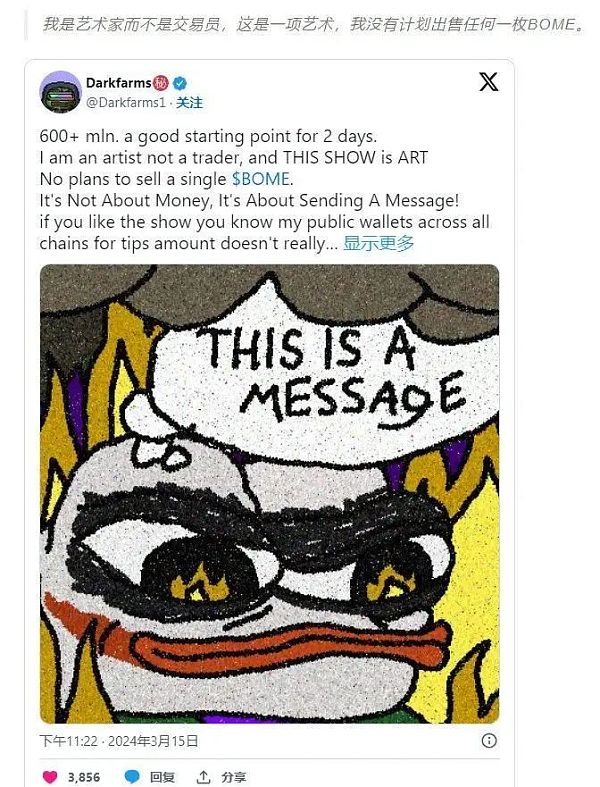 面对BOME 飙涨的币价,其作者Darkfarms 昨日稍晚在X 平台上发文表示,并不会出售手中的BOME: