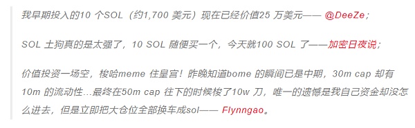 随着BOME 的爆红与疯涨,越来越多的投资者开始在社交平台上晒出自己的暴富收益,或称赞Solana 链的Meme 币,例如: