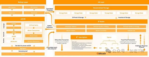 DA 层包括了去中心化存储、B² 节点以及 BTC 网络,主要负责永久存储 Rollup 数据副本、验证 Rollup 的 ZKP,并在 BTC 网络上进行最终确认。去中心化存储确保了数据的持久和可访问性;B² 节点执行各种网络操作,如验证、排序和数据打包;BTC 网络则负责最终确认交易,保证了系统的安全性和不可篡改性。这三部分协同工作,大大提高了网络的效率和可扩展性,同时保留了其去中心化的本质