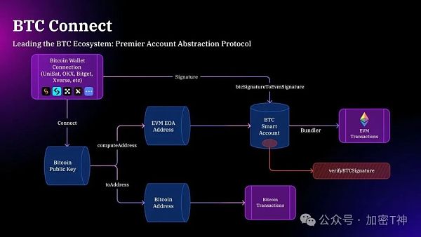 Merlin Chain 的技术架构的核心特点在于其链无关性(Chain-Agnostic)的账户体系以及由 Particle Network 提供的 BTC Connect 技术。这些创新不仅实现了 BTC 地址与 EVM 地址之间的无缝映射,还为用户提供了一个高效且安全的跨链互动环境。