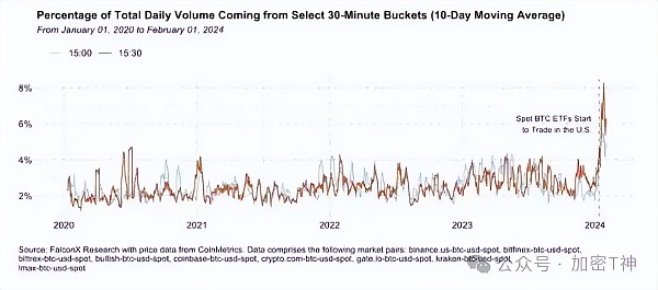 由于比特币ETF提供了一个一致且透明的市场价格参考点,大宗交易减少了来自矿工的潜在抛售对市场的影响。每日总量的大幅增加,从之前的平均5%上升到10%至13%的范围。