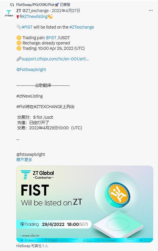 同时,ZTEXCHANGE的官方推特也宣布了#Fist代币将在该交易平台上市的消息。交易对为$Fist/USDT,充值功能已经开放,交易将在2022年4月29日10:00(UTC)开始。这为投资者提供了另一个参与Solana生态系统和模因代币热潮的机会。