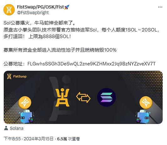 此外,原盘古小拳头团队的技术人员也宣布将进军Solana生态系统,并通过官方推特账号进行宣传。他们提供了一个投资Alpepe的机会,每个人的投资额度在1SOL到20SOL之间,如果超出这个范围,多余的部分将被退回。这个项目的上限设定为8888个SOL,意味着这将是一个相对小型但可能非常受欢迎的投资机会。